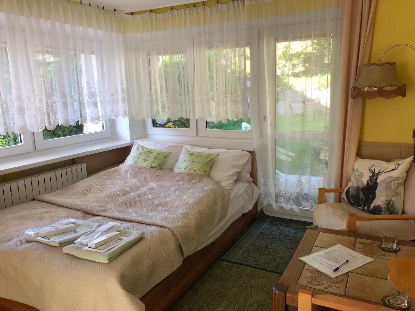Pokój Dwuosobowy z widokiem na góry. Providing free toiletries, this double room includes a private bathroom with a shower, a hairdryer and slippers. Guests will find a stovetop, a refrigerator, kitchenware and a microwave in the kitchen. The double room also offers a barbecue. The double room provides soundproof walls, a dining area, a wardrobe, a flat-screen TV with satellite channels, as well as garden views. The unit offers 1 bed. Pokój Dwuosobowy - 2 osobowy. Powierzchnia pokoju ok.: 10 mkw. ;