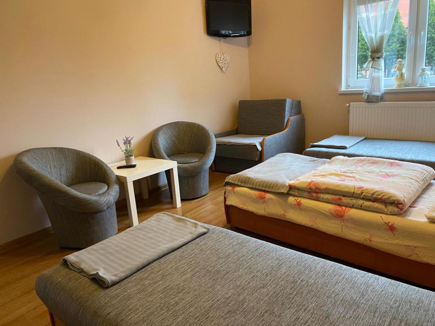 Pokój trzyosobowy z łazienką. The triple room features a private entrance, a wardrobe, as well as a private bathroom boasting a shower. The triple room has a flat-screen TV, an electric kettle, a tiled floor, as well as heating. The unit has 3 beds. Pokój Trzyosobowy - 3 osobowy. Powierzchnia pokoju ok.: 17 mkw.